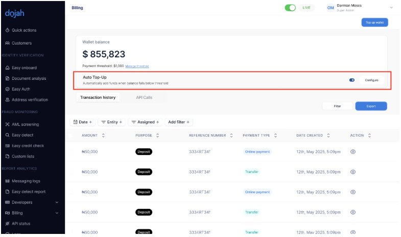 FEATURE ENHANCEMENTSWe are excited to share a few updates added to the dashboard to enhance experiences on the Dojah platform. AUTO TOP-UP The Auto Top-Up feature allows businesses to automatically replenish their wallet balance when it drops below a predefined threshold. This helps prevent service interruptions caused by insufficient wallet balance and ensures continuous access to verification and authentication services. Key Capabilities